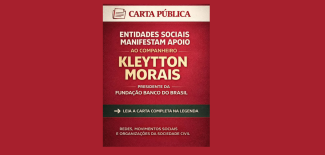 Para as entidades signatárias, essas linhas de atuação refletem uma vocação institucional que foi fortalecida durante a gestão de Kleytton Morais. Por isso, a manifestação propõe sua continuidade na Presidência da Fundação Banco do Brasil, como forma de garantir o compromisso com um projeto de desenvolvimento social orientado pelos interesses dos setores populares e pela construção de um país mais justo e solidário.